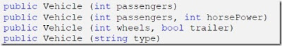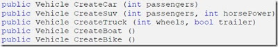 - Các hàm dựng không liên lạc tốt vì chúng phải được đặt tên sau khi lớp của nó đã đặt tên. Có nhiều hàm dựng quá tải (overloaded constructor) có thể làm cho việc này trở nên khó khăn cho lập trình viên client quyết định chọn hàm dựng nào để dùng. Dưới đây là một ví dụ với 4 overloaded constructor. Thật không rõ ràng để chọn ra một constructor để sử dụng.