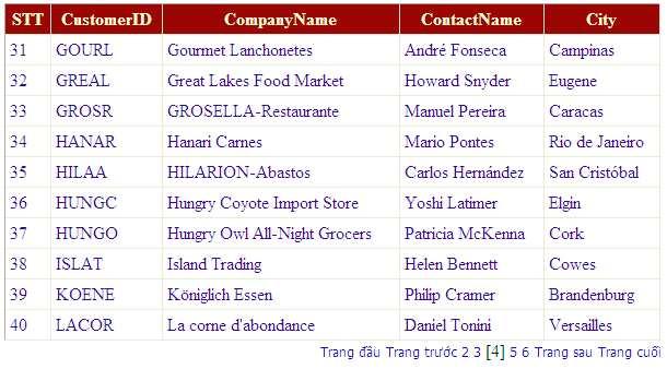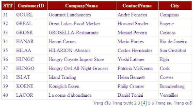 private DataSet StoreToDataSet( int currPage, int recodperpage, int Pagesize) { DataSet dts = new DataSet(); SqlParameter[] arrParam = { new SqlParameter("@currPage", SqlDbType.Int), new SqlParameter("@recodperpage", SqlDbType.Int), new SqlParameter("@Pagesize", SqlDbType.Int) }; arrParam[0].Value = currPage; arrParam[1].Value = recodperpage; arrParam[2].Value = Pagesize; return ThucThiStore_DataSet("spCustomers_PhanTrang", arrParam); }3. Hàm nạp dữ liệu để hiển thị