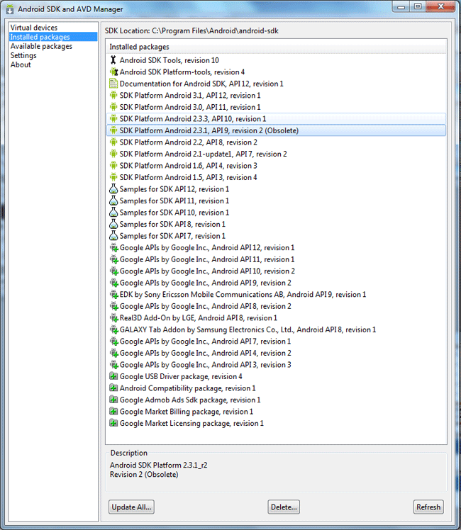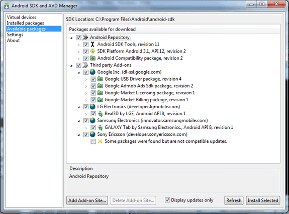Trong Android SDK Manager làm mới tất cả các gói và cài đặt tất cả các gói có sẵn và đi vào các gói cài đặt và kiểm tra tất cả các gói cài đặt: