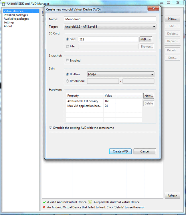 Lưu ý: Đừng bắt đầu virtual device/Emulator từ Android SDK Manager, Mono sẽ tự động bắt đầu nó từ Visual Studio.