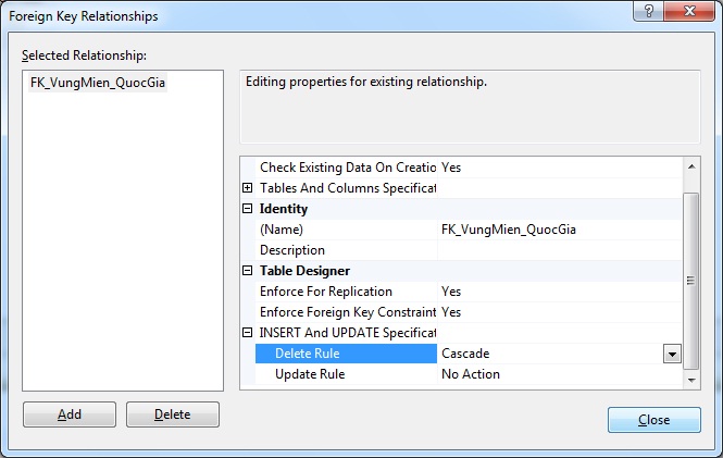 Click dấu cộng "INSERT And UPDATE Specifical", tại Vùng Delete Rule, mặc định là No Action, bạn chọn Cascade, rồi nhấn Close và lưu lại